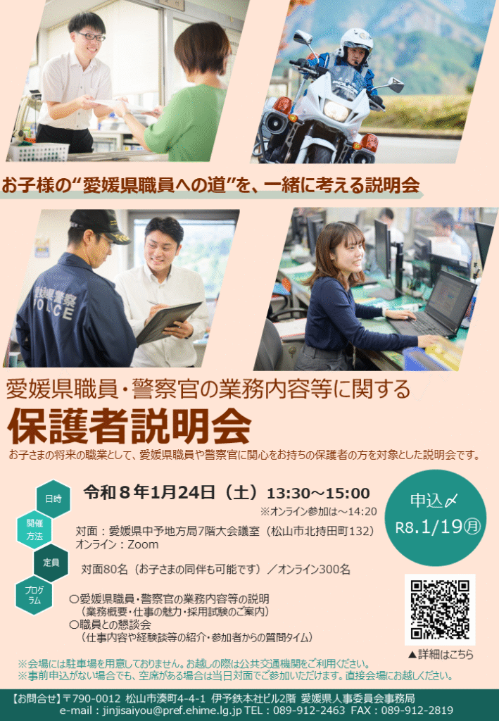 お子さまの将来の職業選択や就職・転職活動に関心のある保護者の方を対象に、県職員及び警察官の仕事内容等を紹介し、理解を深めていただく説明会を開催します。
